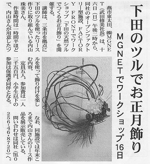三条市の下田地区の野山で取れたツルを使ったお正月飾りのワークショップで、地元燕三条所縁の物をの実際に手に取り体験していただきたいという想いから開催が決まりました。