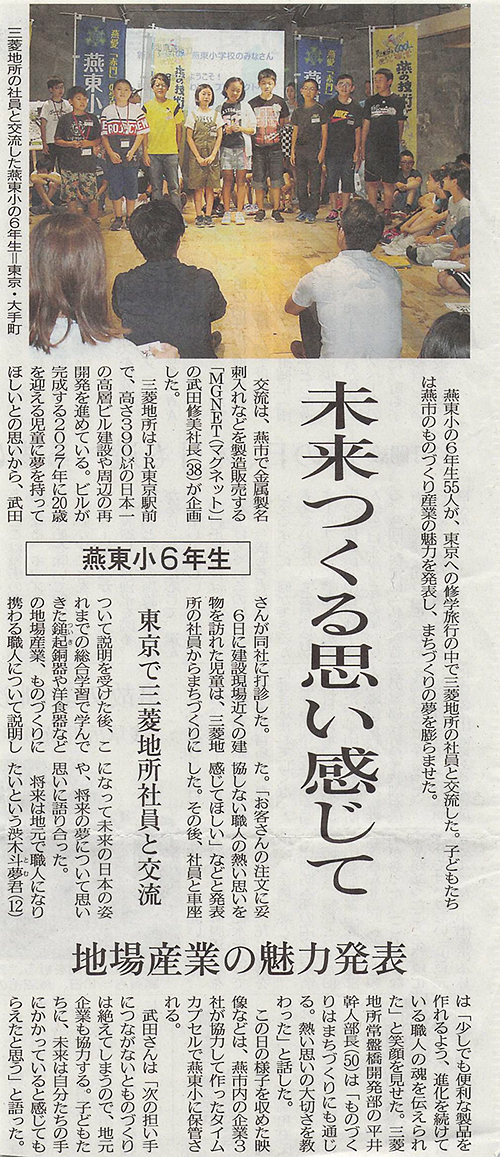 三菱地所様からのまちづくりのお話や、児童の総合学習で学んだ地元燕の産業の発表、そして児童と三菱地所様の社員の方との夢交換など当日の様子を掲載いただきました。