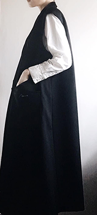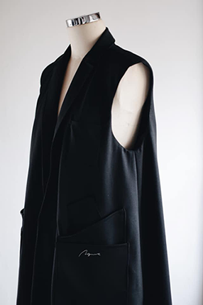 形状はロングベスト。ショップでのお客様対応を考慮し、インナーを選ばず軽快に羽織るイメージで釦などはなく様々なサイズのポケットを付けることで素早くワークショップ対応にも移行できる仕様に。MGNETらしくカジュアルな印象を残しつつ細めのテーラーカラーは繊細さを際立たせ無骨な印象にならないよう心がけました。
